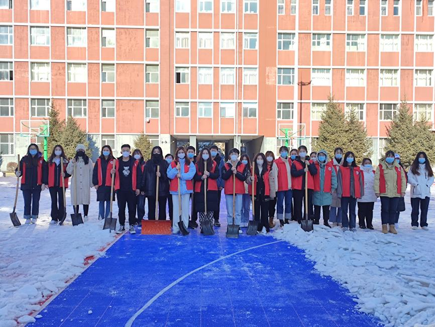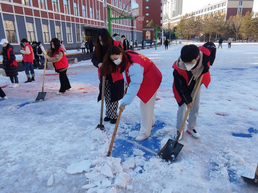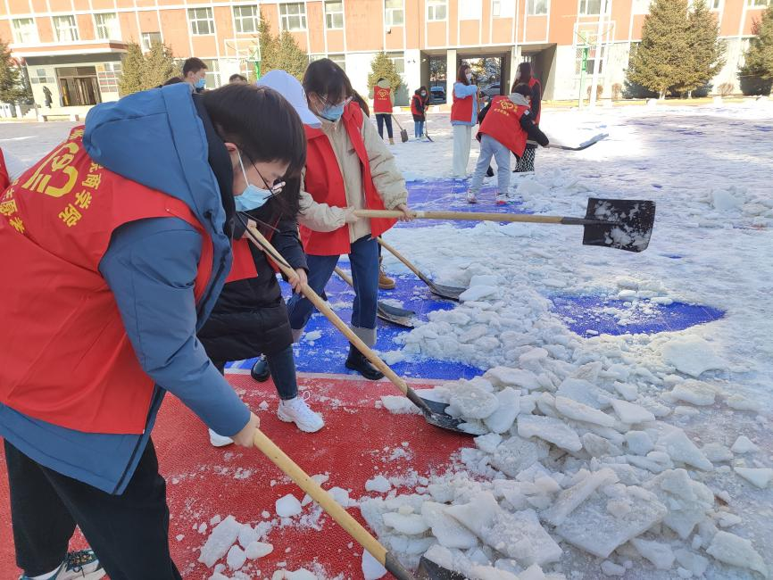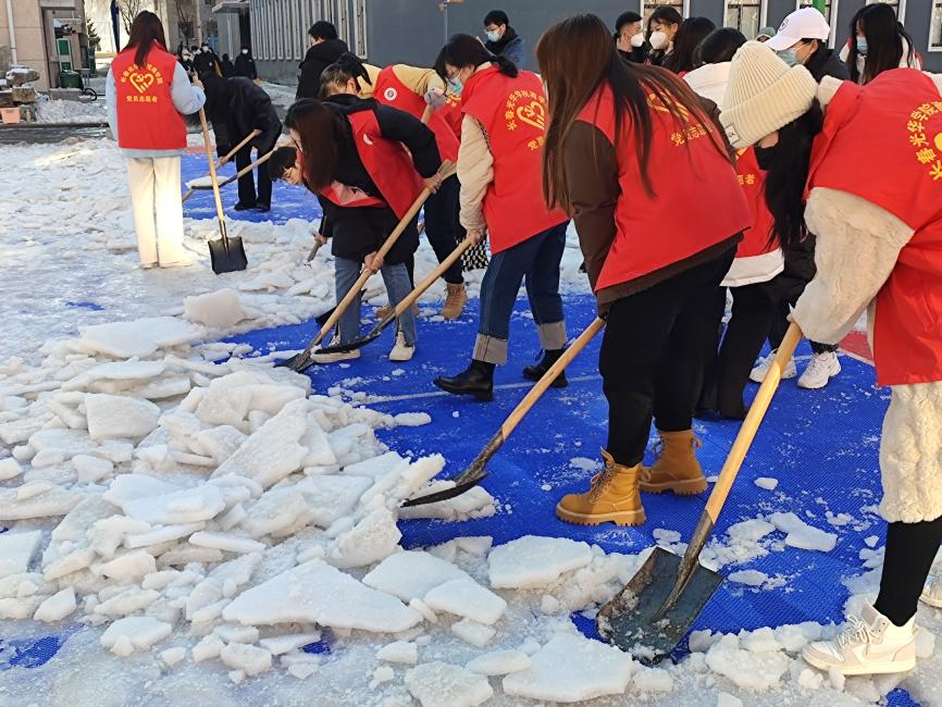 铲碎坚冰、铲除积雪、清理路面,全程没有一个人退缩掉队,大家齐心协力,不轻视每一处道路积雪,不放过每一个坚冰暗碴,“嚓嚓嚓”,“咔咔咔”的声音,构成了一首在这冬日光华中最动听的交响曲。大家都热火朝天,干劲十足,经过大家一个多小时的集中奋战,道路变得整洁通畅。