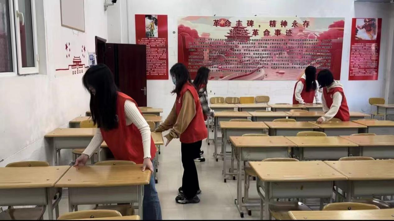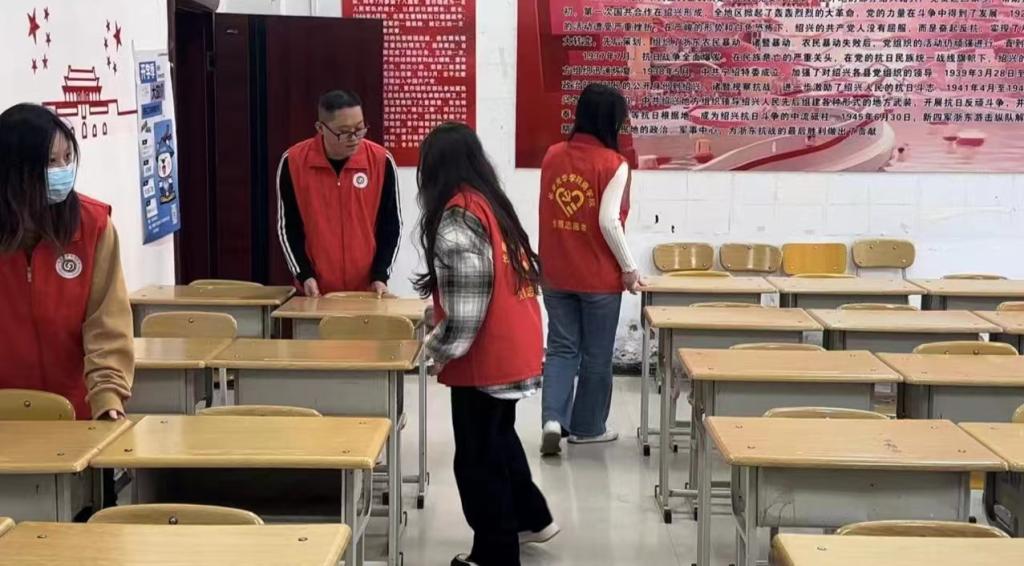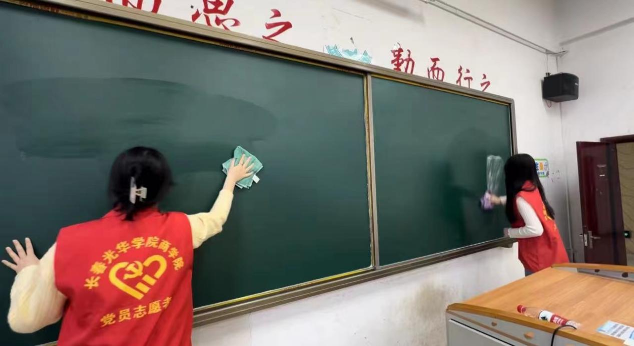 活动过程中,在商公司员工党支部的领导下,员工党员工作站策划落实了美化教学环境志愿服务活动,党员们身穿红色马甲,分成五组,走进第三教学楼,分层美化教室环境。大家带着手套、扫帚等工具,合理分工,干劲十足,对各个楼层的教室、楼道的角落进行了彻底的清理:整理桌椅、擦黑板、清洁地面等。经过1个多小时的努力,各教室变得更加整洁有序。党员们充分地发挥了不怕累不怕脏、乐于奉献的志愿服务精神,用实际行动践行雷锋精神。