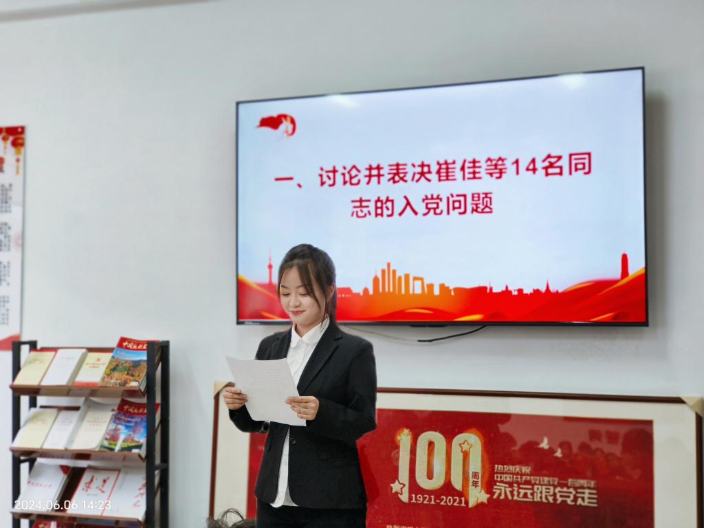 入党介绍人分别介绍发展对象的情况,发表是否同意发展其入党的意见。程琳同志代表支委会向支部大会汇报对崔佳等14名同志的培养教育考察和政审情况。支部委员会经过充分酝酿和认真讨论,一致认为崔佳等14名同志基本具备党员条件,决定提交支部党员大会讨论其能否被接受为预备党员的问题。