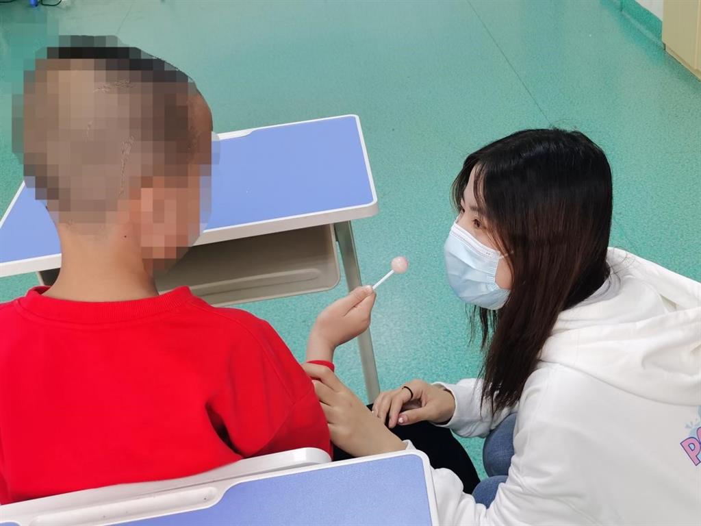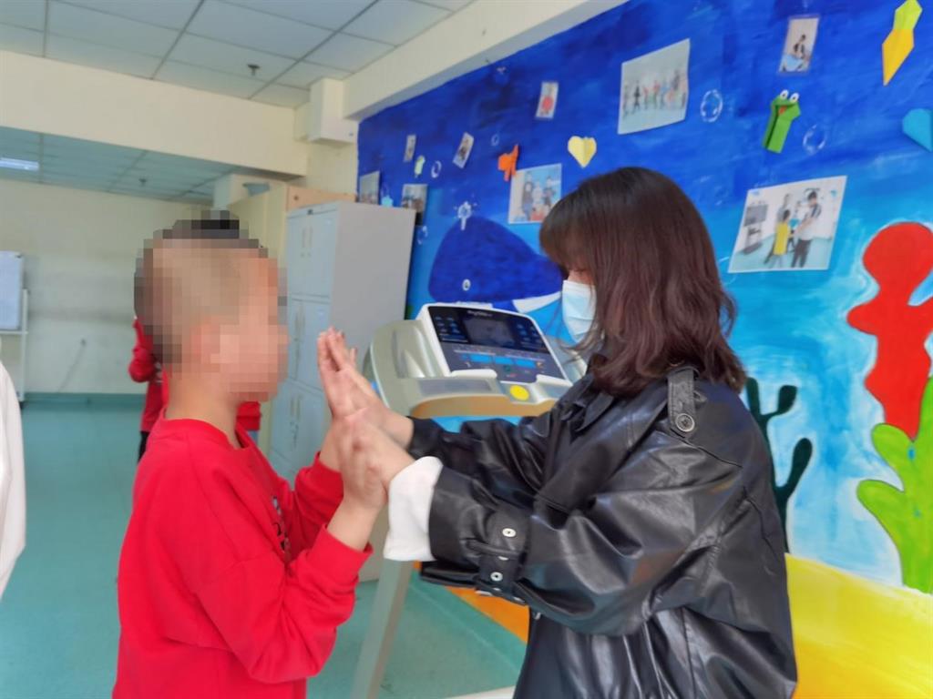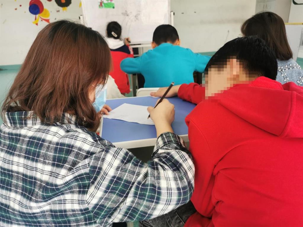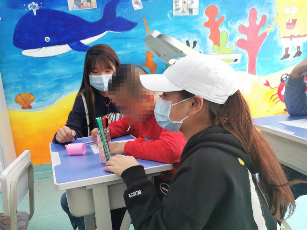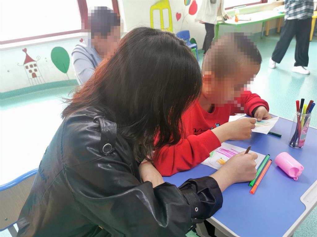 活动伊始,志愿者陪孩子们做手指操,活动手部关节。这种手指操能够调动孩子们的听觉、视觉、触觉各种感官,对大脑发育十分有益,这也是孩子们每天的必修课。