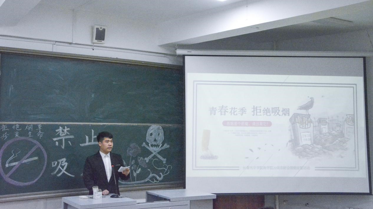 活动第一项,主持人阐述了通过我国吸烟大数据调查结果显示的,因吸烟疾病导致死亡的人不在少数。可怕的数字警醒着同学们应对吸烟问题重视起来。接着,主持人还讲述吸烟对青少年的危害,并呼吁同学们提高自我控烟意识,拒绝吸烟。