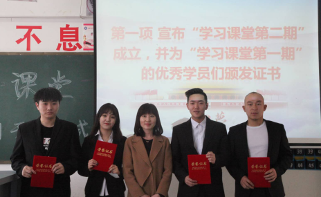 仪式第三项,学习筑梦课堂第二期学员代表荣妍同学发言。她说到:“青年兴则国家兴,青年强则国家强。十九大为我们奠定了新的思想武器,青年一代有理想有本事有担当,国家就会富强。”