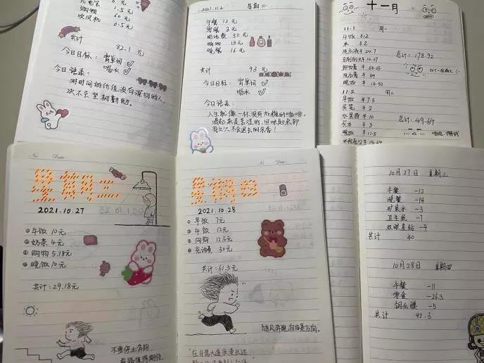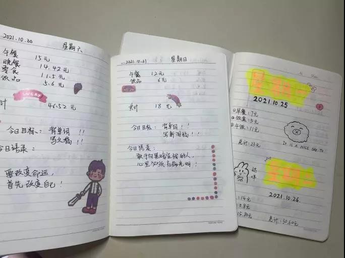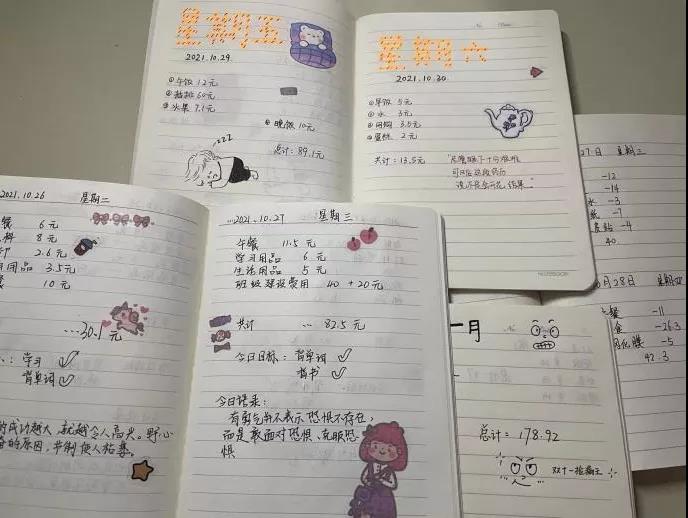 为树立取之有度,合理消费的金钱观念,有助于勤俭节约习惯的养成,养成教育勤俭节约小组进行了每日用度的手账记录。这些颇为精美的手账是同学们认真生活的印记,热爱生活,认真前行的人,最终会被岁月温柔治愈。