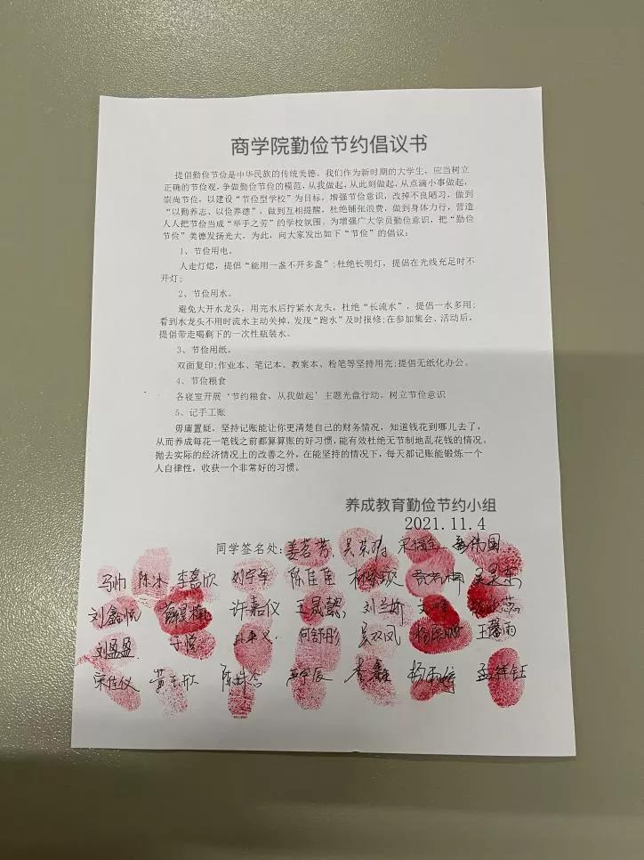 同学们积极响应号召,签署了关于勤俭节约养成教育活动的倡议书。在橙黄的灯光下,笔端在白纸上落下的娟秀楷体,是他们为青春韶华谱写的华章,是他们对自我成长的见证,是他们在成为理想中的自己路上的又一个具有纪念意义的里程碑。
