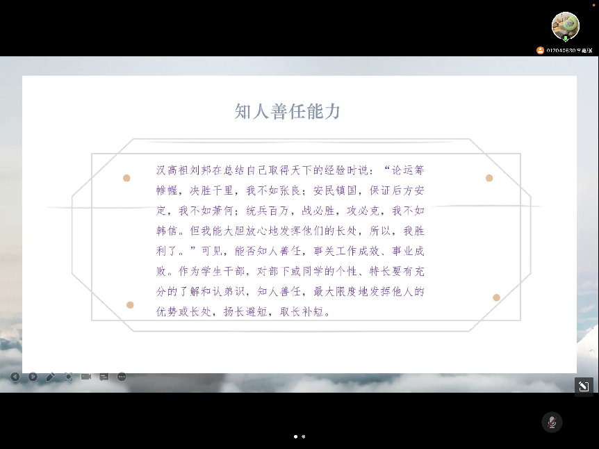 会议中,李嘉骥首先通过古代名人事迹讲述了知人善任能力的好处,鼓励大家在工作中要积极地去了解每个人的优缺点,实现能力互补,以便日常工作更好地开展。其次,开拓创新能力就是要在工作中不断创新,新鲜、活力、吸引力应是开展各类活动时参照的重要因素。学习与工作的关系主要强调的是员工干部的能力素质,调节生活节奏、把握生活主动权相当重要。干部之间的关系强调的是员工干部的沟通与社交能力,沟通、合作,彼此的能力互补能够获得更高的成效。会议最后,同学们纷纷表达自己的看法与主张。员工干部们踊跃发言,讨论交流会中所提出的论点,觉得受益颇深。