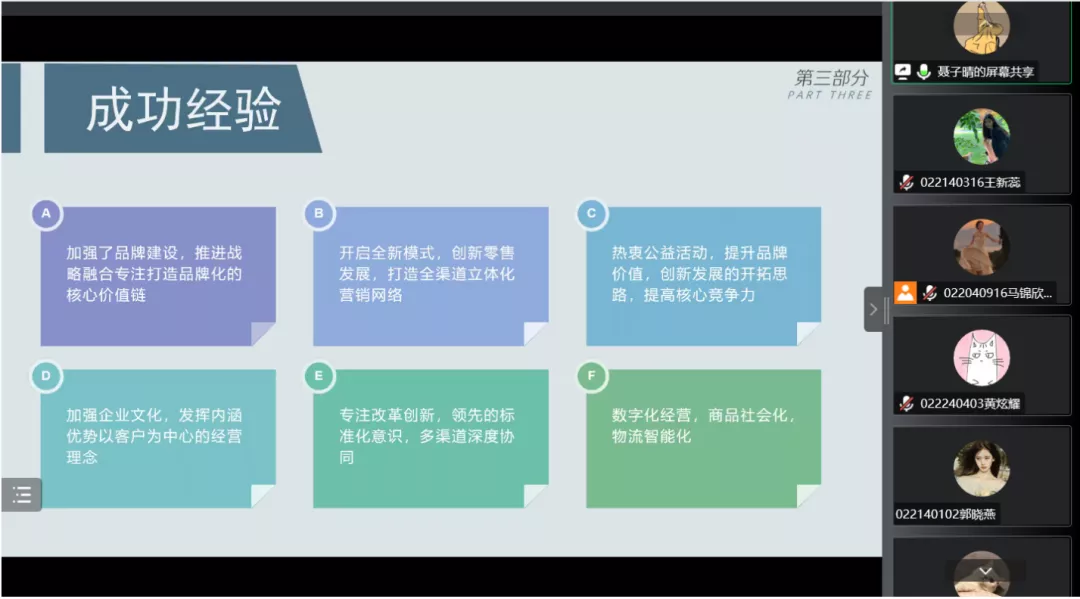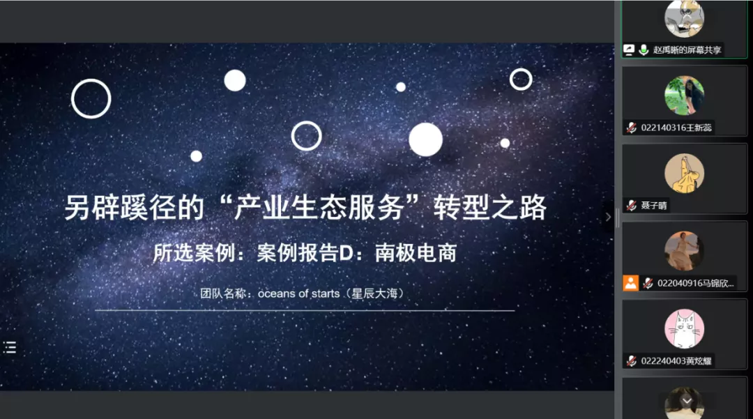 接下来,谢玉雪同学为我们讲述了南极电商的发展之路,从简介、市场分析及发展现状、发展前景及现状、竞争优势等来讲述这个案例,尤其是南极电商模式,在传统行业转型过程中的一个升级型思路,它是行业内的一次产业升级。谢玉雪同学提供了许多有效数据,让大家感受到了这个新模式下带来的利润。