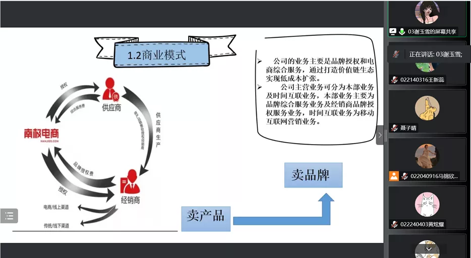 紧接着,由赵禹晰同学展示南极电商的案例分析,为大家讲述了这个公司的商业模式,依靠自身的品牌效应,来赚取综合服务费。运用SWOT分析法总结过去,“卖产品买品牌”的公司发展路线,同时,赵禹晰同学还表达了对南极电商的预期发展,一方面明白品牌未来的定位,另一方面注重产品的研发,也要掌握品控,会有利于品牌的发展。