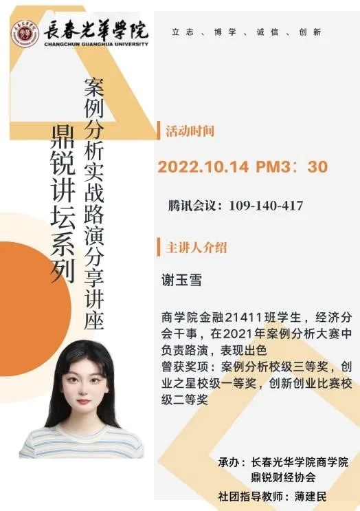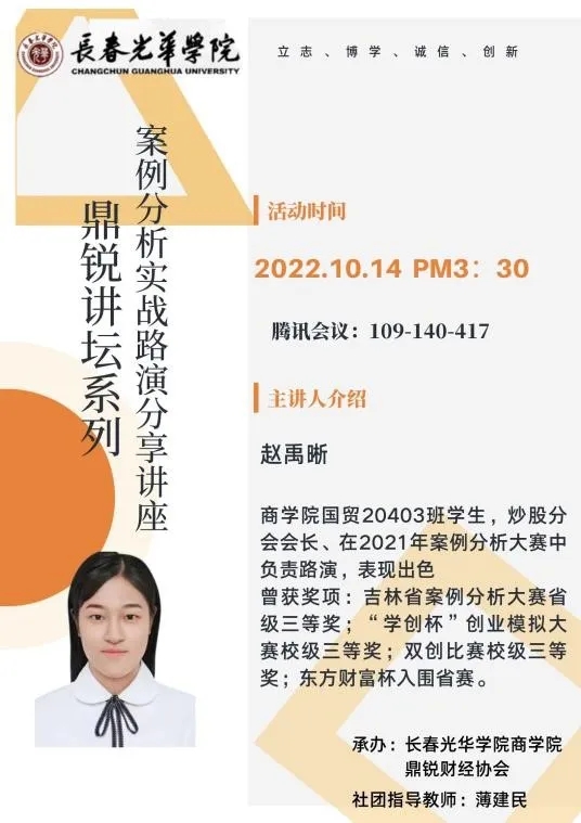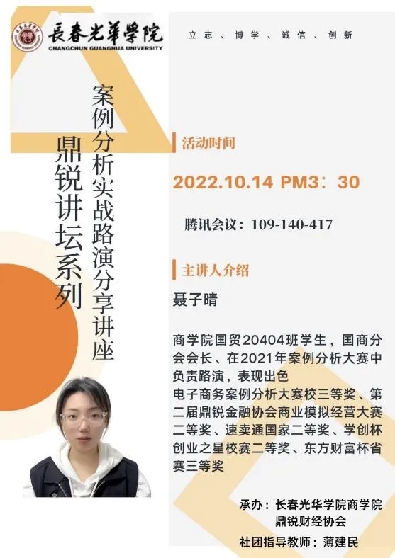 你是否因为对各类专业比赛不了解而放弃机会?你是否苦恼于比赛之前找不到努力方向?为了更好地帮助同学们培养在案例分析实战路演中的能力,提高同学们的竞争意识,鼎锐财经协会开展了鼎锐讲坛系列活动。 本次鼎锐讲坛系列——案例分析实战路演分享讲座,将在2022年10月14日星期五下午3:30在线上举行。此次分享讲座将由三位比赛经验丰富的主讲人分享她们的个人比赛经历以及路演中的实战经验。 欢迎各位同学届时前往参加,与学长学姐们一同探索讨论、交流学习吧。
