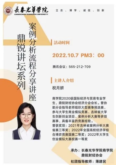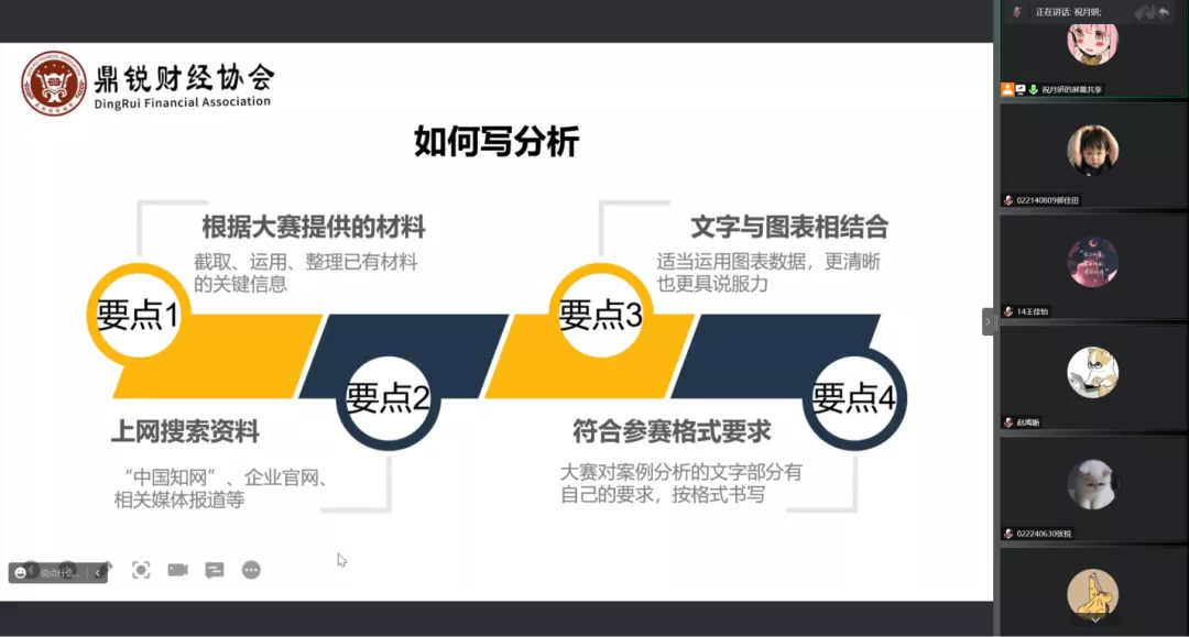 为提升员工案例分析能力,增强员工在老员工案例分析大赛中的竞争力,解决同学们对于案例分析比赛不知道如何选题、如何演讲等一系列问题,MKsports鼎锐财经协会于2022年10月7日15时线上开展案例分析讲座,本次活动由鼎锐经济分会会长祝月妍主讲,鼎锐财经分会全体成员参加。