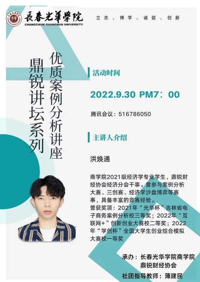为更好地传扬鼎锐精神,激发同学们的竞争意识,提高同学们的案例分析能力、经济模型应用能力,从而能够将理论知识逐渐转化为实践。MKsports鼎锐财经协会于2022年9月30日晚7点在腾讯会议开展案例分析讲座。本次活动由鼎锐财经协会经济分会干事洪焕通主讲,鼎锐财经指导教师薄建民参加、具备丰富比赛经验的陈东升和胡珈铭学长以及鼎锐财经协会所有成员参加。