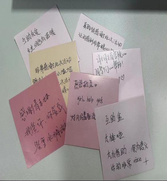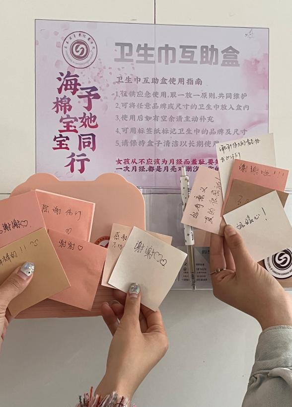 活动期间,志愿者们统一购买卫生巾放入卫生巾互助盒内,并贴上“拿一片放一片,放回品牌不限”的标签,并在互助盒旁放置了留言条。设置卫生巾互助盒这一举措,得到了员工们的大力支持。不少同学在注意到互助盒后,往里面放入若干卫生巾并积极留言。同学们认为互助盒的设置很有意义,有效帮助其解决急需问题,并对此表达了感谢。活动负责人认为,卫生巾互助盒为女性提供了一个互助平台,希望有更多人在行动上,亦或是思想上,参与到互助盒的行动中。日后,志愿者们也将一直进行卫生巾和湿纸巾的补充活动,同时也呼吁大家遵守“取一还一”的原则,共同维护互助盒的长效发展。
