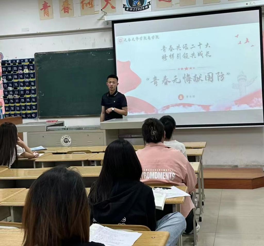 本次校园宣讲由贾东旭同学主讲,他宣讲的主题为“青春无悔献国防”。贾东旭同学作为一名优秀的退伍军人,他以自己的从军经历讲述自己在思想上、生活上的收获和感悟。他从自己二十多次的跳伞经历,七十二个小时的潜水挑战,河南抗洪抢险一线工作以及日常重复训练的刻苦中,向同学们展示了他的军营生活,激励同学们以奋斗姿态激扬青春,传承红色基因,赓续红色血脉,用理论“星火”点燃青年学子的“信仰之光”。
