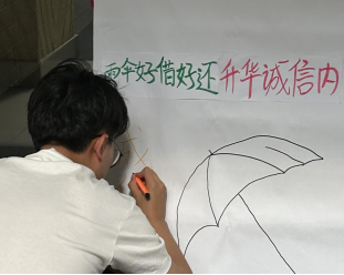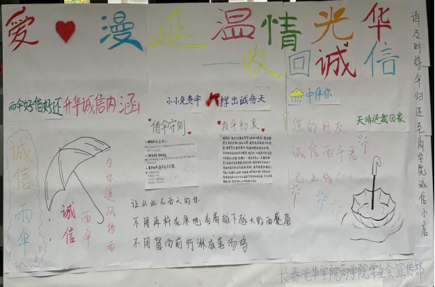本次活动的顺利开展,一方面是为大家减少了一份寒冷、增添一份温暖。另一方面,诚信雨伞活动督促了同学们在生活中要保持诚信,坚守诚信底线,养成良好的校园风尚。一把把的爱心雨伞犹如一朵朵绽放的伞花,成为校园里一道流动的风景线,让我们一同为构建和谐校园贡献一份力量吧!