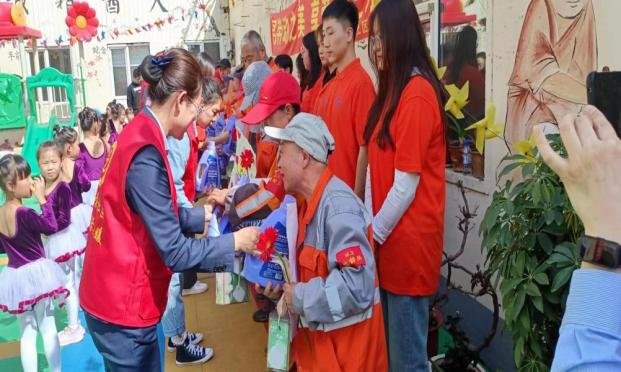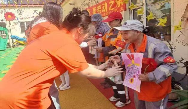 随后,幼儿园的小朋友们为环卫工人们送上了红花和手绘图画,志愿者们送上杯子和毛巾,九台农商行送上了洗衣液。这些看似寻常的礼物,却饱含了大家乃至整个社会对环卫工人默默奉献的感恩之情。活动的尾声,志愿者们跟随环卫工人的步伐进入社区,深入领略劳动之美。志愿者们积极参与,如火如荼地挥洒着汗水,亲身体验到了劳动的艰辛与乐趣。他们的热忱与奉献,让环卫工人感受到了社会的温暖,通过亲身实践也增强了青年志愿者的社会责任感和使命感。