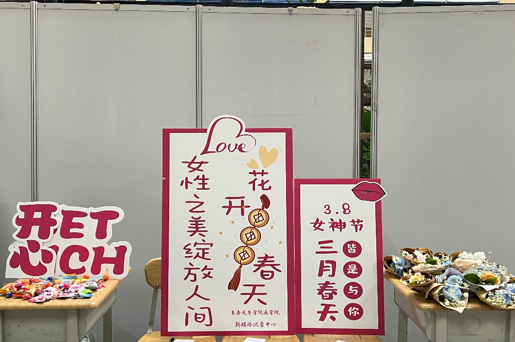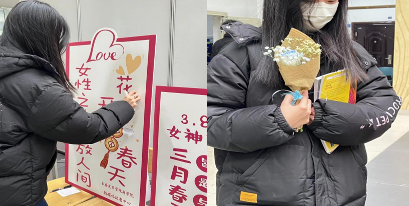 活动前期,志愿者们在现场准备了许多不同颜色的花束以及零食糖果,代表着不同的寓意,这让来到现场的每位女性都能成为活动现场的焦点,并准备了一个与主题相关的板报,供到场的同学们粘贴便签、合影留念。