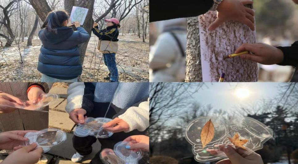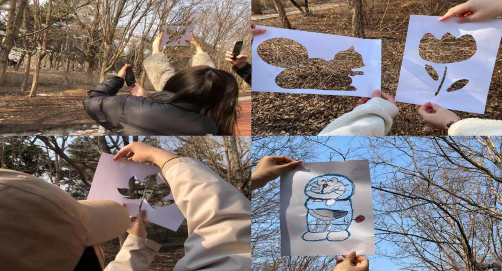 两个小游戏结束后,工作人员将参加活动的同学集合起来进行手工活动。在“手植春光,微景雅韵”手工活动中,同学们将A4纸放在大树树干处,用不同颜色的蜡笔画出了不同大树的皮肤纹理,以手作拓印的形式制作一幅春日印记之画;在“植此春色,一签倾心”手工活动中,同学们收集地上的落叶并整理平整,然后在落叶上面写下喜欢的文字并装进提前准备好的塑封袋里,同学们以落叶为纸,将心语镶于其中,将美与春定格封存,留下了美好的回忆。在“纸间趣造,共赴春日之约”手工活动中,同学们在纸张上根据自己的创意用蜡笔描绘出喜欢的图案,并裁剪出镂空样式,用大自然的色彩为纸张上的图案增添颜色,透过剪纸看春影,定格春天的烂漫。同学们纷纷拿起手机记录下和大自然亲近的每个瞬间。