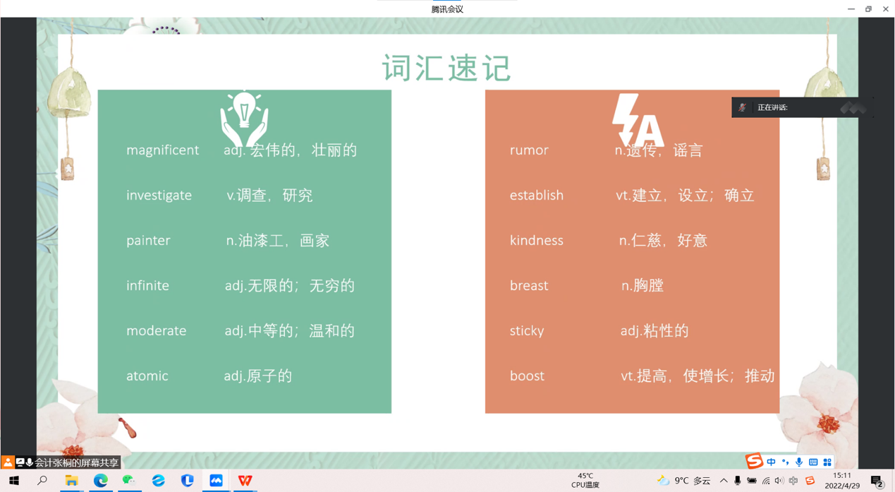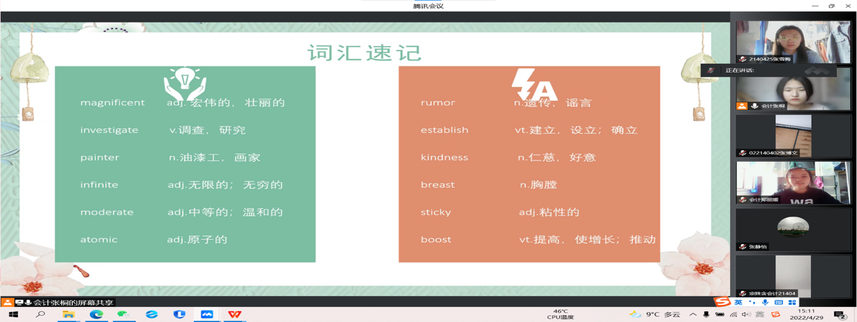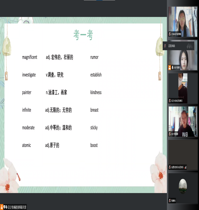 紧接着,负责人采取选人、抢答的方式进行测试,通过单词连线、单词拼写等多种形式,让同学们在背诵的过程中收获满满的参与感与体验感。活动过程中,同学们相互监督、相互学习,营造了比学赶帮超的学习氛围,极大程度提高了员工的学习热情。同学们也纷纷表示通过本次活动不仅提升了英语表达能力,同时也养成了每天坚持学习的好习惯。最后,负责人对本次活动进行总结。至此,本次“Word Show”活动圆满结束。