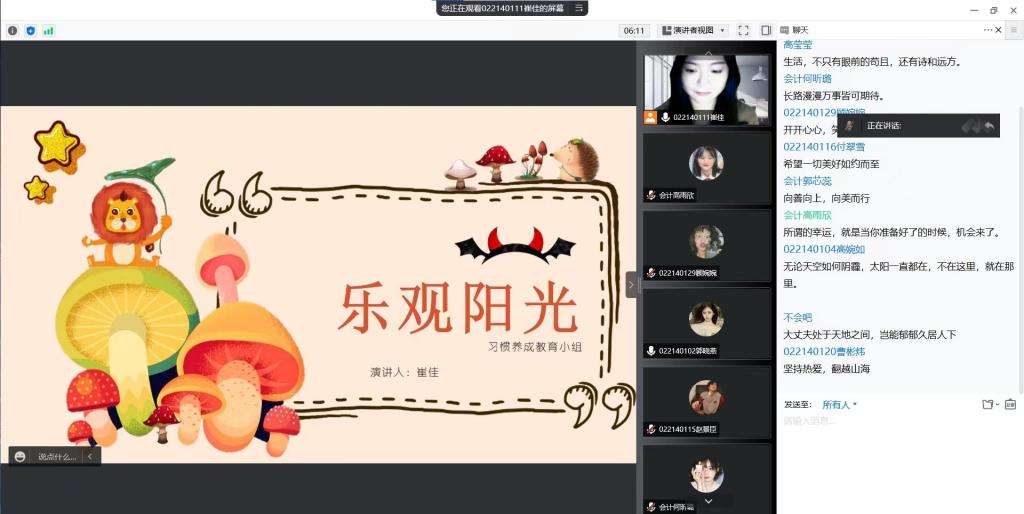 活动伊始,组长崔佳详细阐述了本次活动规则与流程,小组全体成员需绘制与乐观阳光主题有关的海报并进行展示,同时向大家分享自己对乐观阳光的理解与看法。其中陈照忱同学针对抗疫发表了自己的感想,他认为每个人都要出己力、尽己责,多添力、少添乱,要用乐观阳光的心态去面对生活中的每一天,谁拥有了乐观,谁就拥有了希望;谁拥有了乐观,谁就拥有了艰难中敢于拼搏的精神!