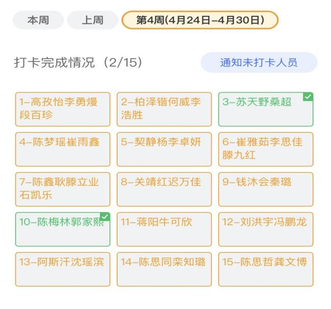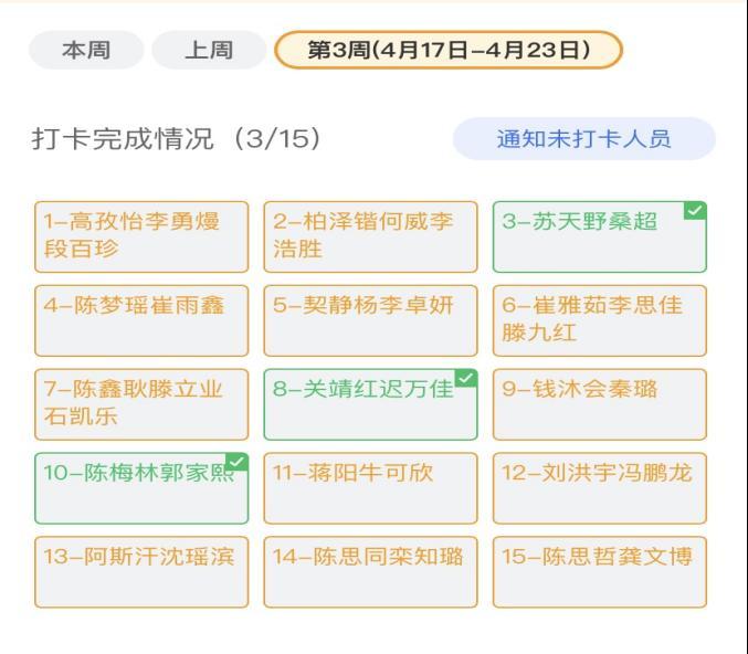 活动伊始,同学们性情高涨,纷纷积极参与到活动中来。确定学习目标,制定学习计划,有条不紊。按照计划进行打卡,做到学有所得。