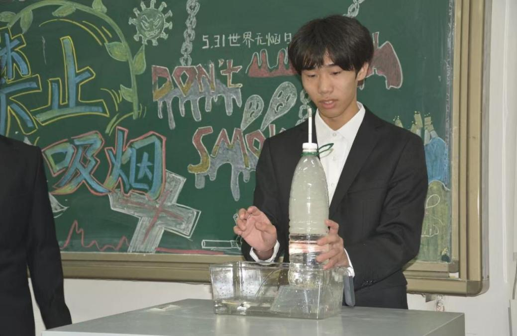 随后,主持人播放禁烟宣传视频,展示了吸烟对身体健康的危害,为吸烟者和潜在吸烟者敲响警钟,并通过现场实验,以实验结果向同学们展示了香烟的危害性,让同学们真实地见识到吸烟的后果,引起他们对吸烟行为的思考和行动。