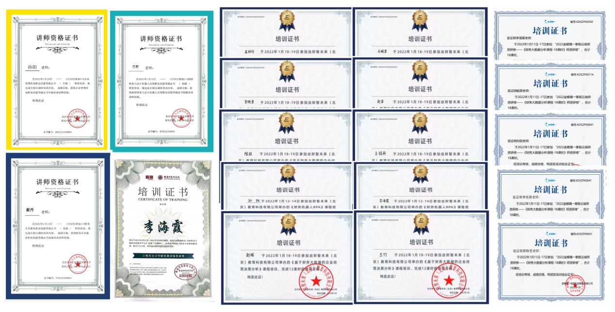 从2022年1月开始,会计学专业与财务管理专业已组织全体教师参加省教育厅、1+X职业技能培训、企业合作研修等10余次,如由金蝶精一信息科技服务有限公司举办的“财务大数据团队研修”“管理会计综合实训团队研修”,财智未来(北京)教育科技有限公司举办的“财务机器人RPA团队培训”“基于财务大数据的企业经验决策分析团队培训”,北京东大正保科技有限公司举办的“企业管理咨询职业技能等级证书团队培训”等。