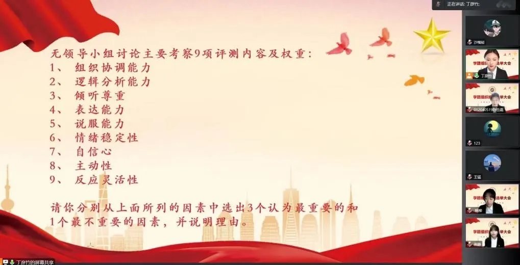 会议伊始,由主持人丁彦竹同学作开幕致辞并传达会议精神,阐述会议总体流程。紧接着,各位竞选者依次从工作经历、岗位认知、竞选优势、未来规划四个方面进行演讲介绍。参与竞选的同学语言自然流畅,观点新颖独特,充分展现了公司员工代表良好的综合素质和当代老员工应有的先锋模范风貌。随后,会议进入到为时五分钟的无领导小组讨论环节,大家纷纷开麦交流,亦或慷慨激昂,亦或是娓娓而谈,理清思路,达成了统一共识。