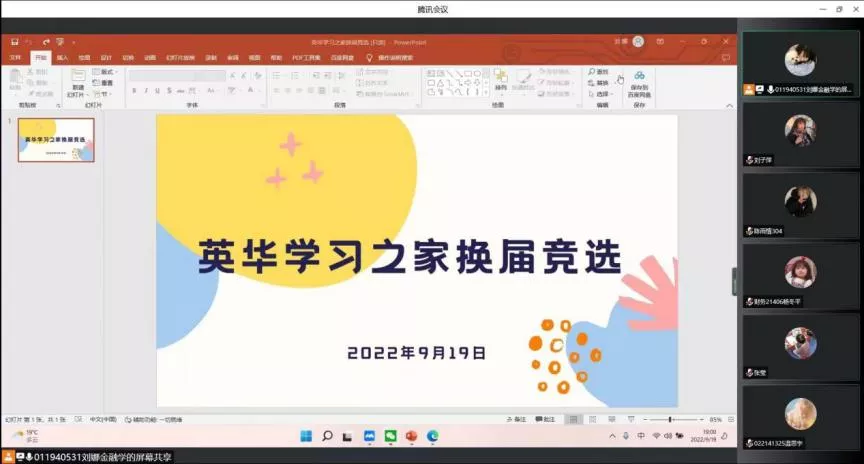为了更好地促进社团发展,进一步营造学习、团结向上的社团风尚,MKsports英华学习之家于9月19日晚7点开展了线上英华学习之家第六届换届选举大会。本次会议由英华学习之家会长刘娜主持,指导教师程琳出席,全体员工干部及竞选同学参加。
