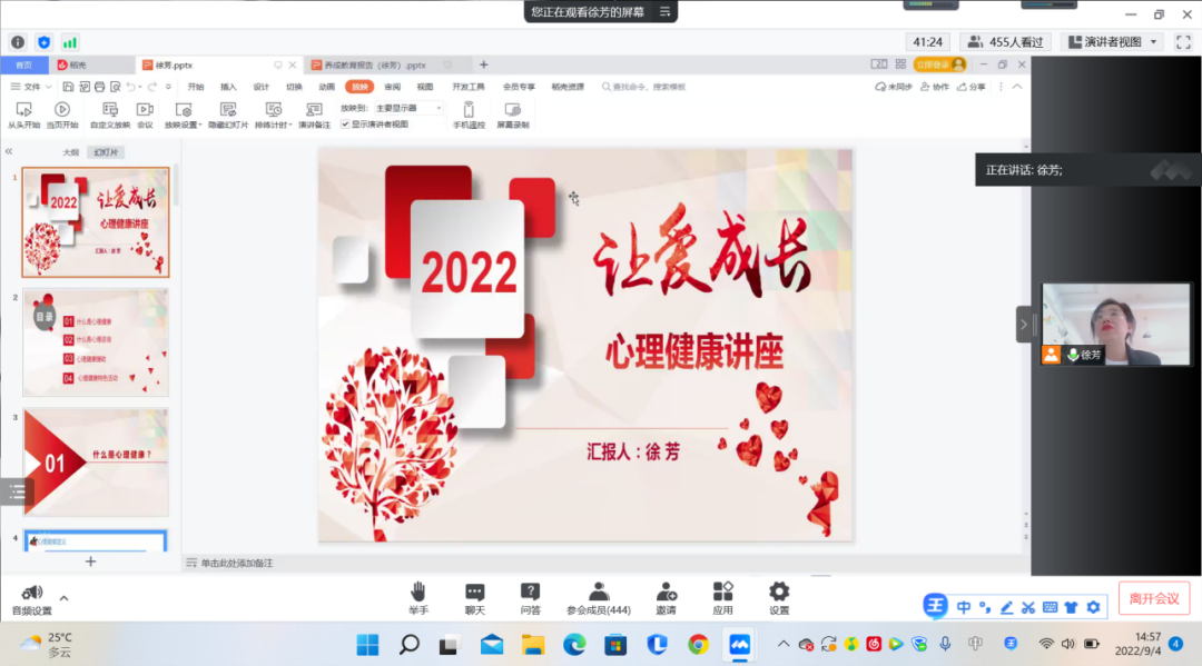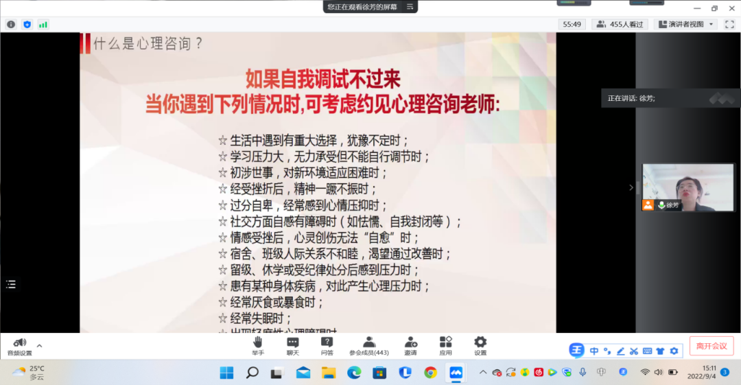 为进一步帮助初入大公司园的22级同学们提高心理健康素质,促进老员工的心理健康和谐发展,MKsports于2022年9月4日下午14时30分以网络会议形式展开了心理健康教育宣讲活动,本次会议由MKsports徐芳老师主持,全体22级同学参加。