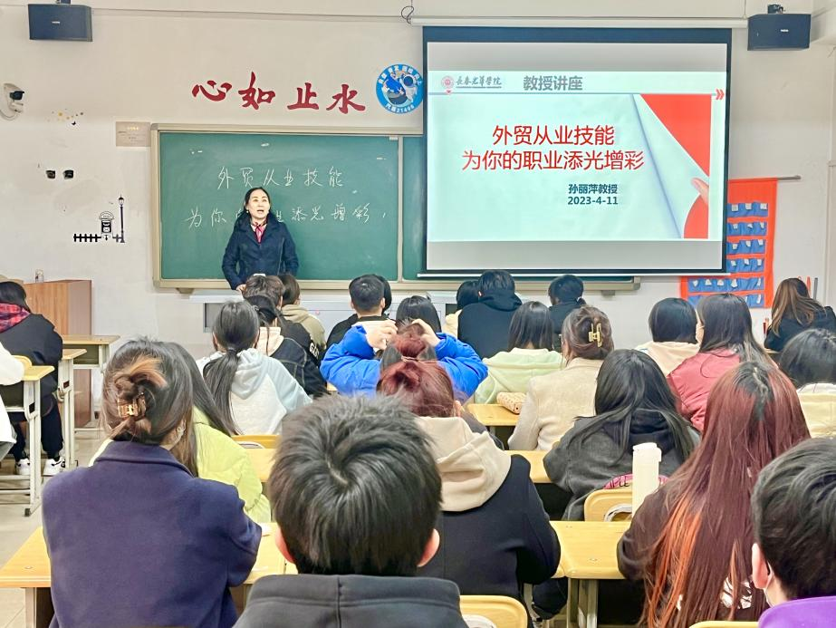 讲座伊始,孙丽萍教授进行了简单的自我介绍,以自身多年丰富的外贸经验为大家阐述了外贸工作的主要特点及要求,接着孙丽萍教授从岗位介绍、考试介绍以及如何具备外贸从业技能三个方面为同学们进行深入的讲解。关于岗位介绍,孙丽萍教授从职责内容、发展空间、职位要求等方面为大家推荐外贸从业多种岗位,并表示只有提高自身认知和能力,才有选择的机会,决定结果的是认知与能力,不是岗位。关于考试介绍,孙丽萍教授通过详细的案例分析、现场互动等多种方式全面解析基础题型和进阶技巧,同时希望同学们可以面向实践、提高使用英语完成任务的能力,为实现终身发展奠定基础。关于如何具备外贸从业技能,孙丽萍教授先是对国际贸易知识及出口流程进行了简要介绍,紧接着以外贸知识、外语知识、计算机知识、沟通协调能力四个方面来讲解外贸实操技能知识,并详细地阐明了外贸企业人才需求的变革。