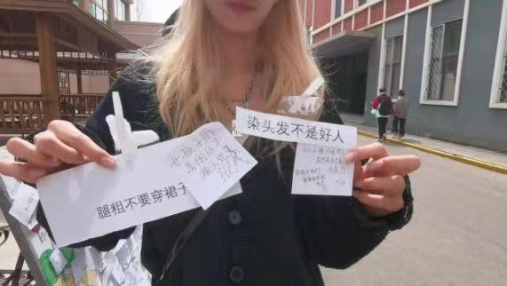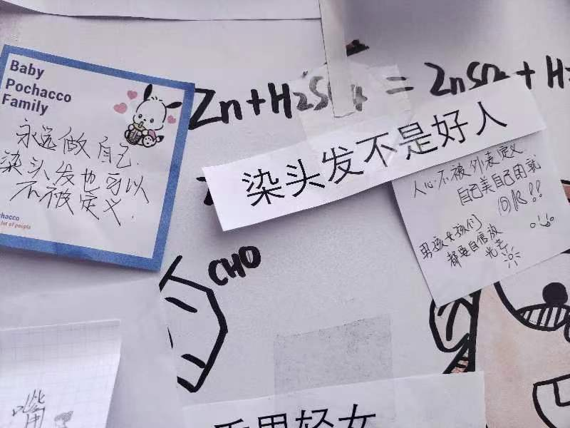 活动过程中,工作人员们在校园里摆上了贴满带有刻板印象标签的展板,来往的师生纷纷在此驻足,并在展板前认真观望。在工作人员们的不断鼓励下,大家上前坚决地撕下了那些带有自身被定义的标签,取而代之地写上反驳的文字贴在展板上,相互传递着温暖的力量。一句句鼓励的话语不仅给予了自己勇气,还提醒着同学们要携手守护身边的每一个人,拒绝给他人“贴标签”。最后,工作人员为每位撕掉标签的同学送上精心准备的小礼品,作为挣脱束缚、肯定自己的奖励。