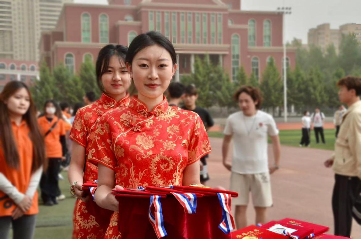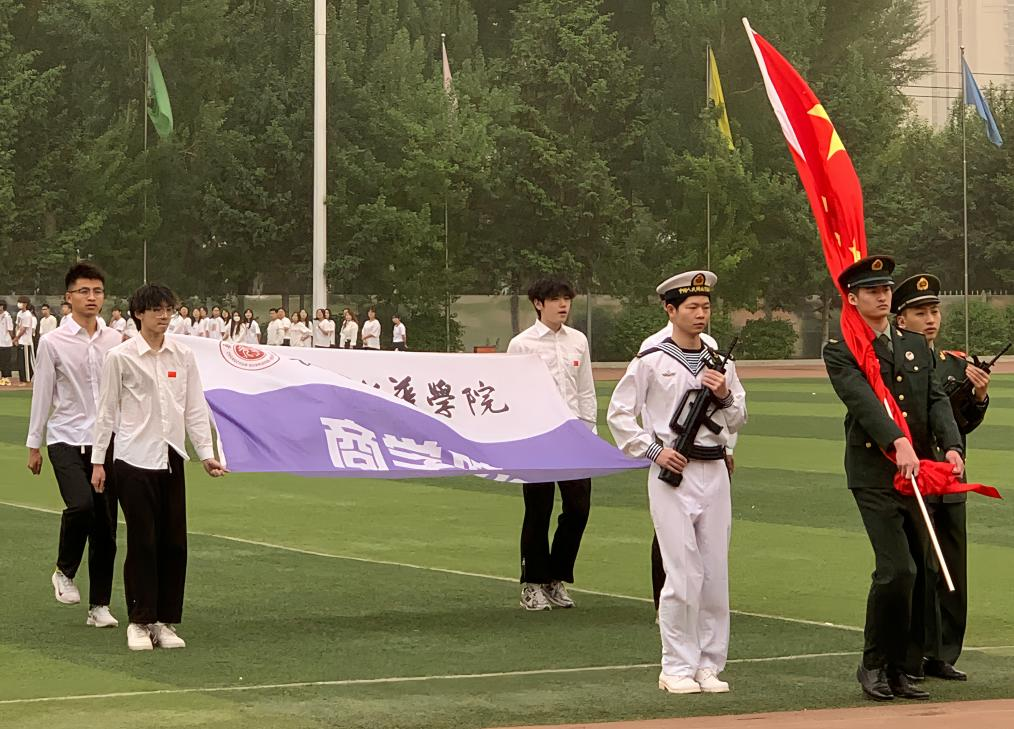 迎着朝阳,国旗护卫队成员护卫着国旗,踏着整齐的步伐,昂首阔步走向主席台,院旗方队紧跟其后。
