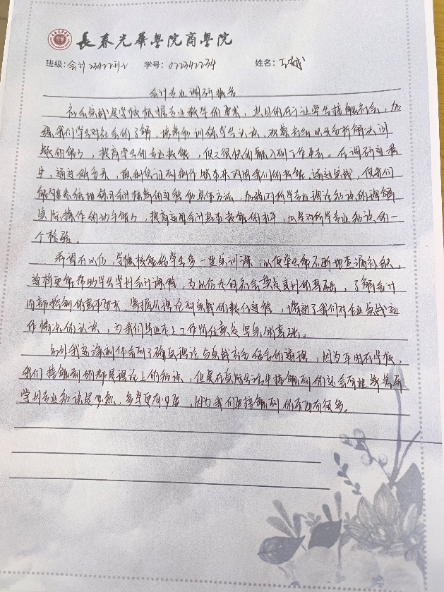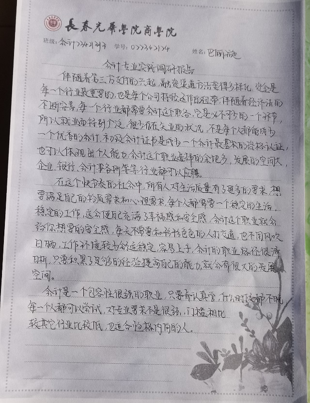 会计学23421班的巴俪璇同学以会计专业的实际应用与理论知识为选题。她记录实践中的所见所感,分享成长收获,并对会计专业的未来发展提出见解。她还了解到,会计学作为传统学科,涵盖面广且专业知识精深。随着科技进步和经济发展,会计行业面临更多变革与挑战。为此,她呼吁同学们不断学习新知识、新技能,以适应行业发展需求。