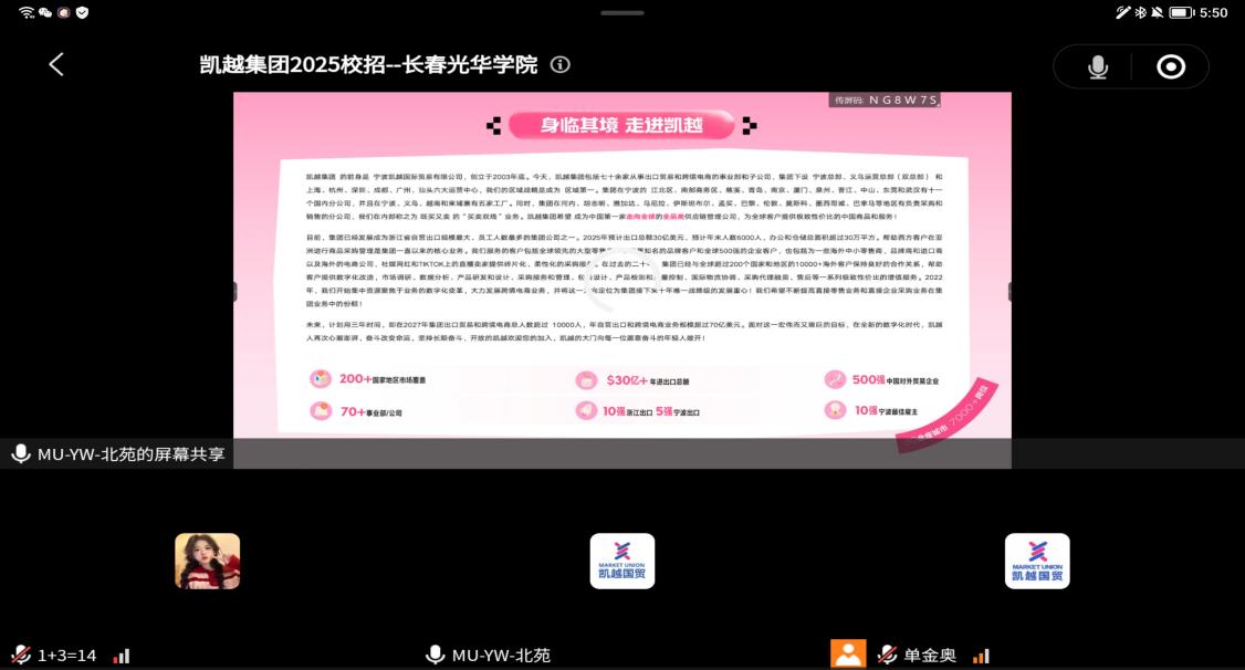 本次宣讲会通过线上直播的方式,向MKsports员工详细介绍了集团的发展历程、业务范围及未来规划。凯越集团负责人表示,凯越集团正处于快速发展阶段,对高素质、复合型的外贸人才需求迫切,此次走进Mksport体育,就是希望能够发现更多潜力股,为集团的发展注入新鲜血液,同时强调了凯越集团对高素质、复合型外贸人才的渴求与重视。最后,凯越集团负责人还分享了外贸行业的最新趋势及发展前景,鼓励Mksport体育的学子们积极投身外贸事业,把握时代机遇,实现个人价值。