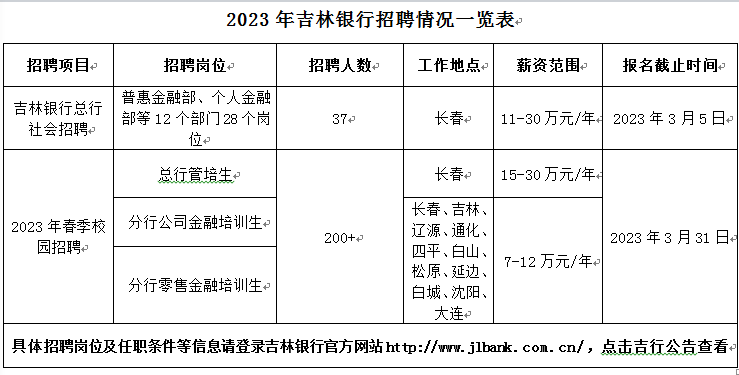 近日,吉林银行公布了2023年招聘信息,吉林银行总行携11家分行面向社会公开招聘200余人,招聘岗位涵盖总行机关员工岗、总行管培生及分行培训生。