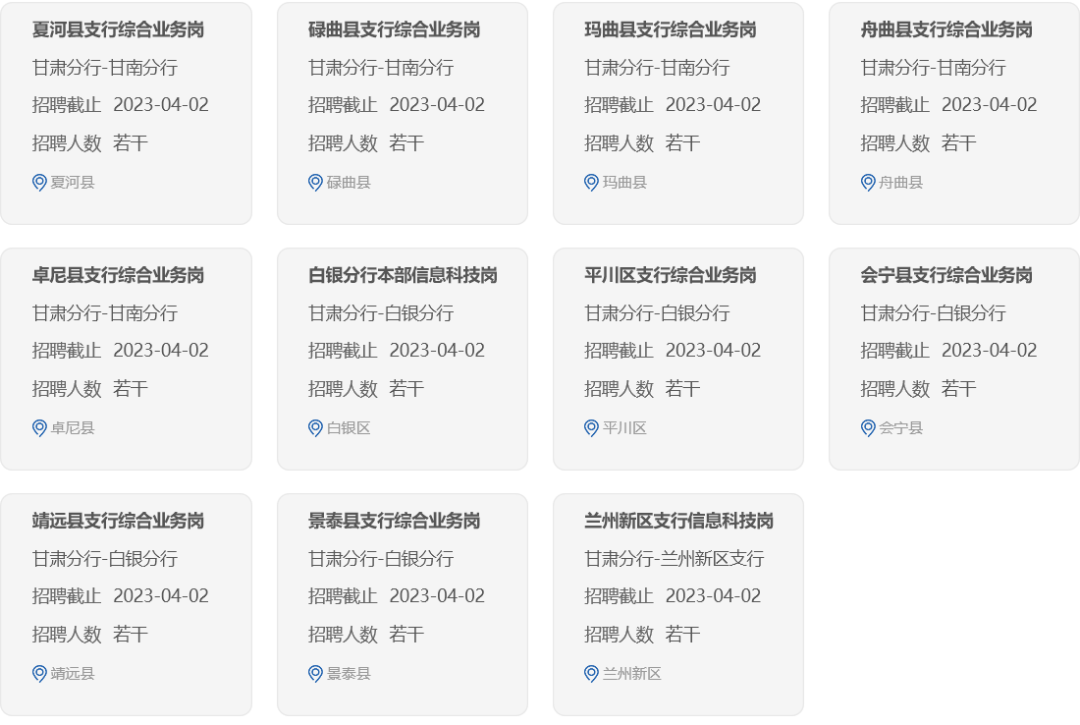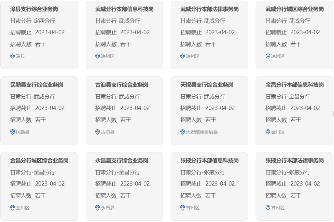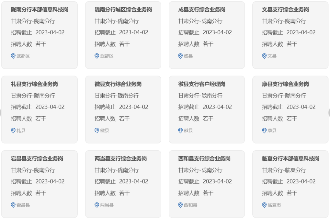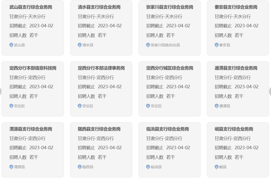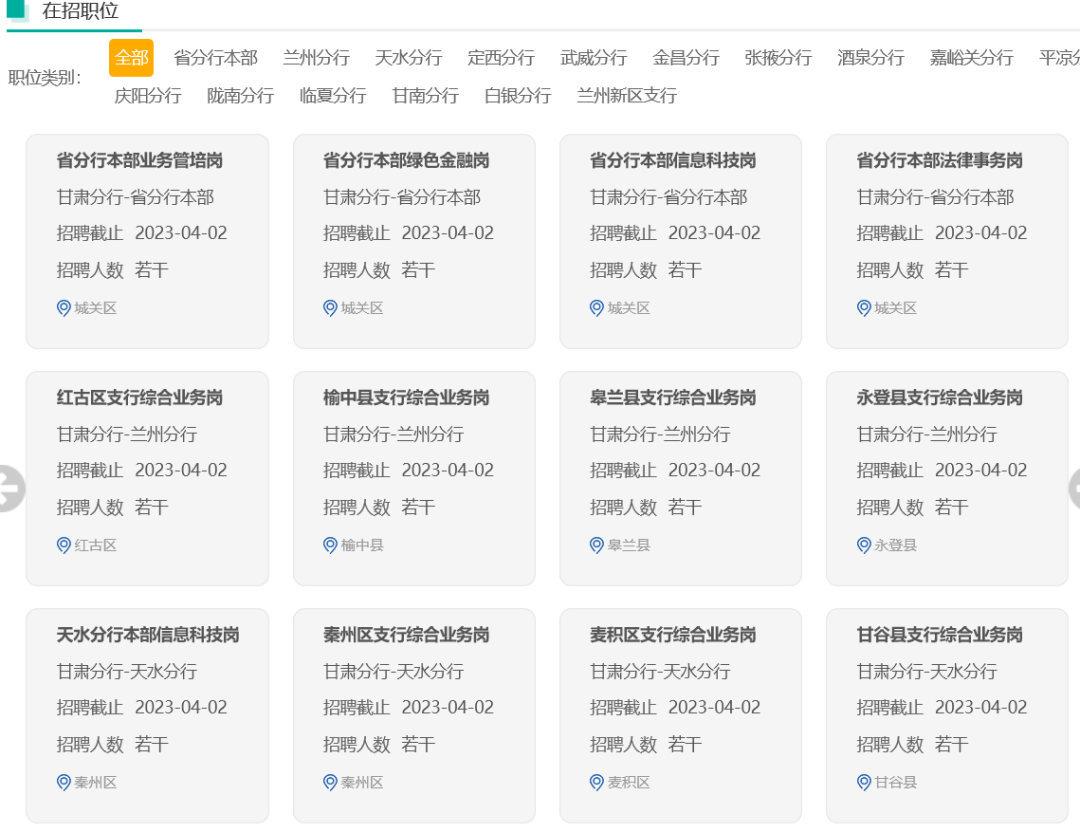 (八)综合业务岗。主要为我行培养和储备综合营销、业务运营、信息科技、财务会计、风险控制、法律合规等专业型和管理型人才。录用人员将安排在我行基层营业网点岗位工作,后期视个人表现及工作需要选拔到合适的岗位点击获取职位表。