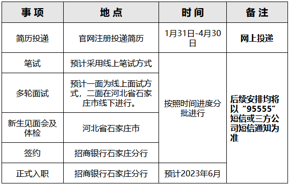 现根据业务发展与人才培养的需要,招商银行石家庄分行面向全国高校诚邀2023年应届毕业生加盟,具体要求如下:
