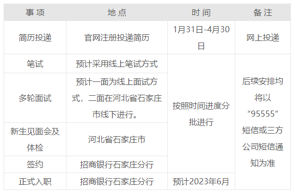 现根据业务发展与人才培养的需要,招商银行石家庄分行面向全国高校诚邀2023年应届毕业生加盟,具体要求如下: