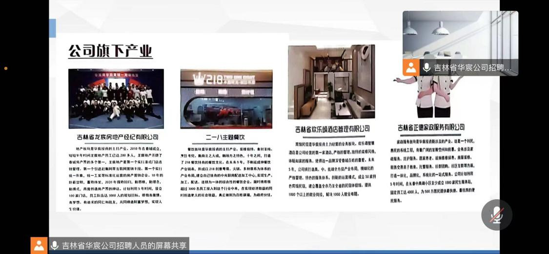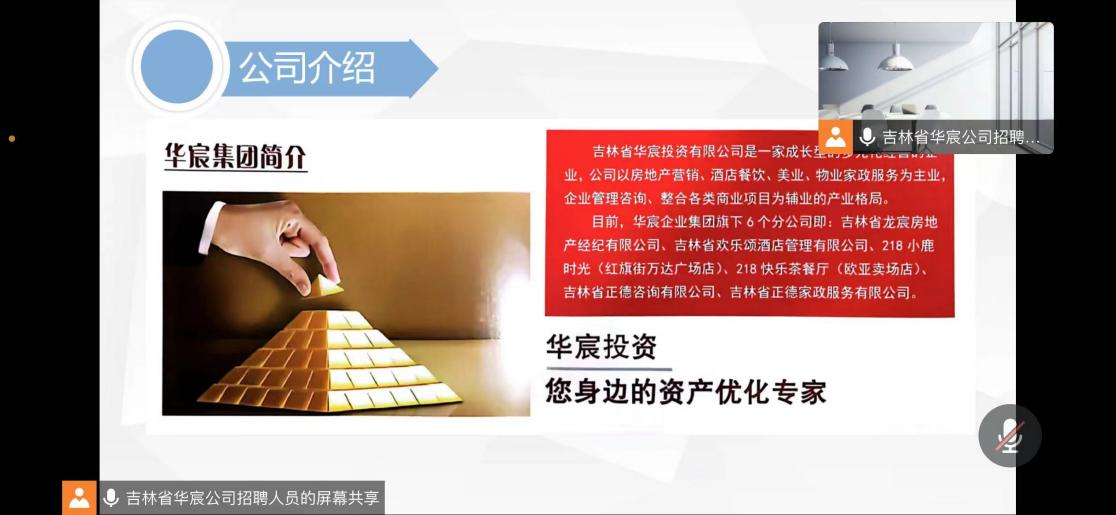 会议伊始,主讲人对吉林省华宸投资有限公司的企业情况、旗下产业等情况作了具体的介绍。他指出,吉林省华宸投资有限公司是一家成长型的多元经营企业,公司以房地产营销、酒店餐饮、美业、物业家政服务为主业,企业管理咨询、整合各类商业项目为辅业的产业格局。随后,主讲人介绍了华宸投资自2020年启动至今的“百校联盟”计划,联动吉林省内多所院校,签约人才并对人才进行全方位的培训。