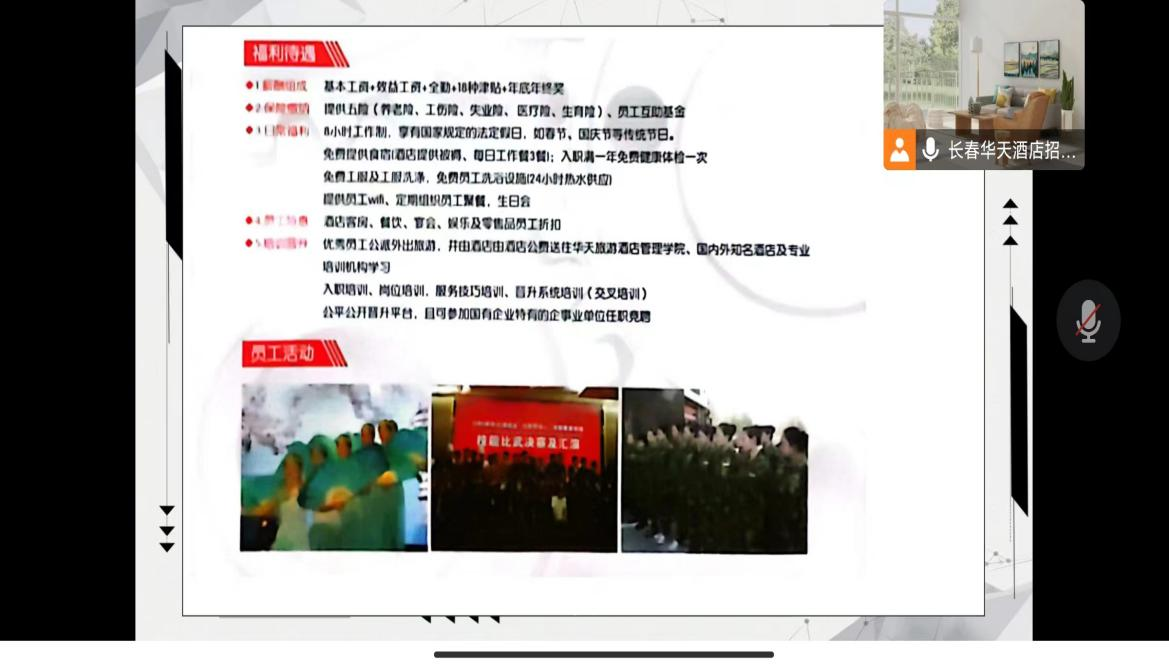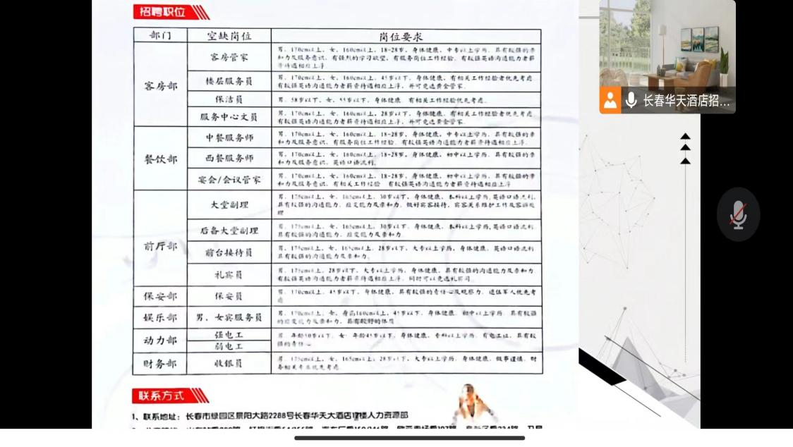 为持续扩展就业渠道,开拓就业资源,确保就业工作不断线,提高毕业生就业服务质量,MKsports联合优秀企业,于2023年4月24日在腾讯会议开展长春华天大酒店线上招聘宣讲会。MKsports2023届毕业生辅导员董建男、张立早出席本次招聘会,长春华天大酒店招聘经理主讲,2023届毕业生参与本次会议。