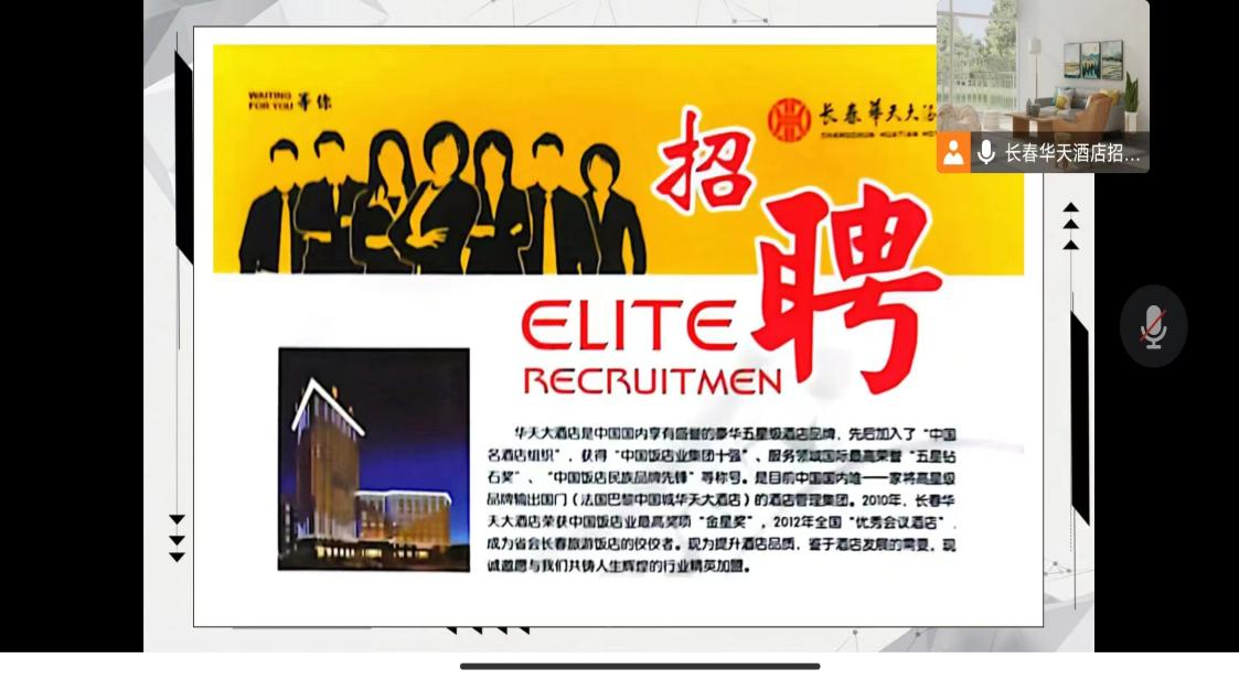 本次招聘会分为招聘企业宣讲与交流互动两个阶段。会议初期,长春华天酒店招聘经理通过演示文档和视频的形式为毕业生介绍了工作单位的企业背景、工作环境、用人需求、福利待遇以及工资待遇等内容。她介绍称,华天大酒店是中国国内享有盛誉的豪华五星级酒店品牌,先后加入了“中国名酒店组织”,获得“中国饭店业集团十强”、服务领域国际最高荣誉“五星钻石奖”、“中国饭店民族品牌先锋”等称号,是目前中国国内唯—一家将高级品牌输出国门的酒店管理集团。