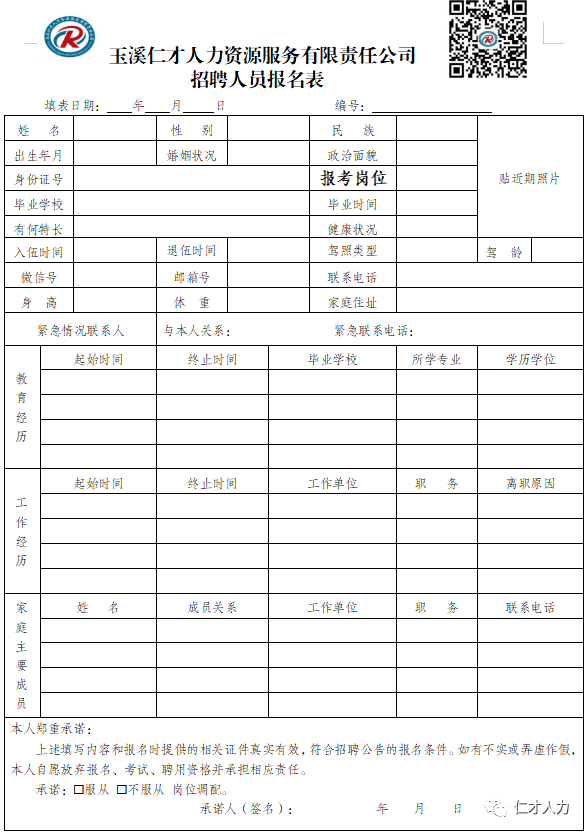 现场报名须填写提交《玉溪仁才人力资源服务有限责任公司招聘人员报名表》(附件),本人身份证、学历证书、及报考岗位所需的相关资格证书、获奖证书原件及复印件1份,原件当场审验后退还本人,收取复印件。近期同底版正面免冠彩色小1寸照片1张(背面注明姓名)。