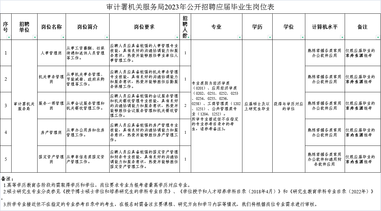 (二)资格审查。严格按照公告,对报名的考生进行资格审查,主要审查报考人员资格条件,包括专业、学历、学位等。资格审查结果将于报名截止后15个工作日内在审计署网站公布。对通过资格审查的人员,我局将电话或短信通知笔试、面试的时间地点。通过资格审查人数少于3人的岗位,不再进行招聘。