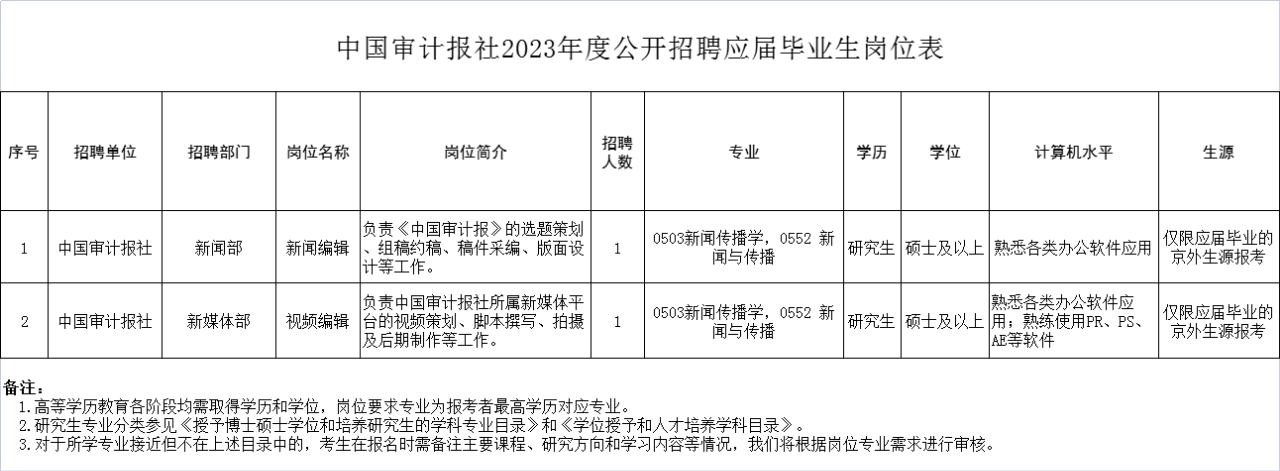 中国审计报社为审计署直属事业单位。根据工作需要,现面向社会公开招聘应届毕业生。现将有关事项公告如下: