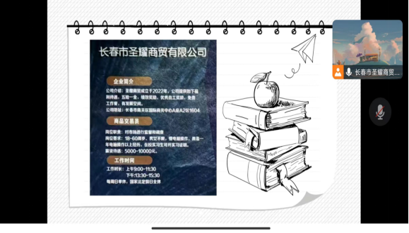会议伊始,招聘人员对长春市圣耀商贸有限公司的企业情况、福利待遇以及岗位需求等方面进行了具体的介绍。长春市圣耀商贸有限公司成立于2022年,公司提供福利待遇,如五险一金,绩效奖励,优秀员工奖励。目前招聘商品交易员,其岗位职责主要是对市场进行监督和调查。同学们积极与企业进行线上交流,向企业了解招聘岗位的情况。