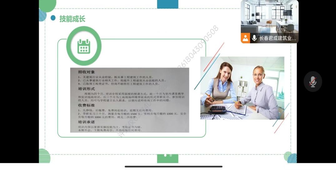 会议伊始,长春君成建筑公司负责人为到场的毕业生讲解了公司发展前景、主营业务、人才培养、招聘需求等方面内容。他提到,长春君成建筑业务培训有限公司成立于2015年。其公司经营范围包括一般项目:业务培训工程管理服务与信息咨询服务,提供有关于建设信息、工程管理服务、劳务信息、企业管理、人力资源、人才信息、工程造价等方面的咨询。本次招聘主要针对当前就业形势展开说明,鼓励应届毕业生积极抓住就业机会,了解就业要求。招聘人员与毕业生辅导员一致希望在场员工要在学好专业知识的同时,做好自身职业生涯规划,找寻自我实现的价值与目标。