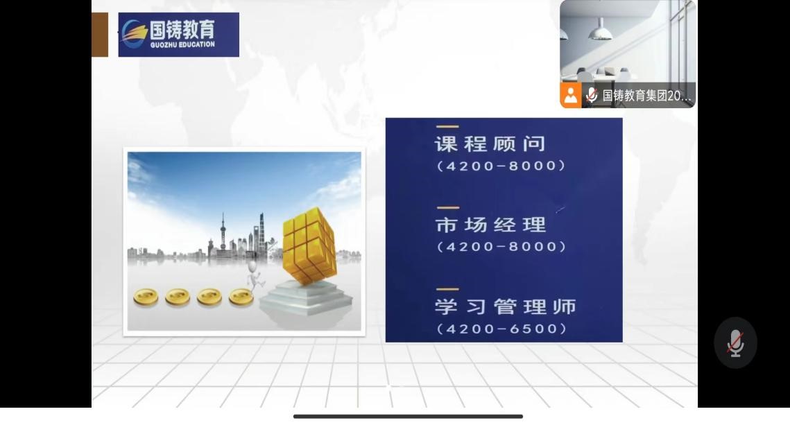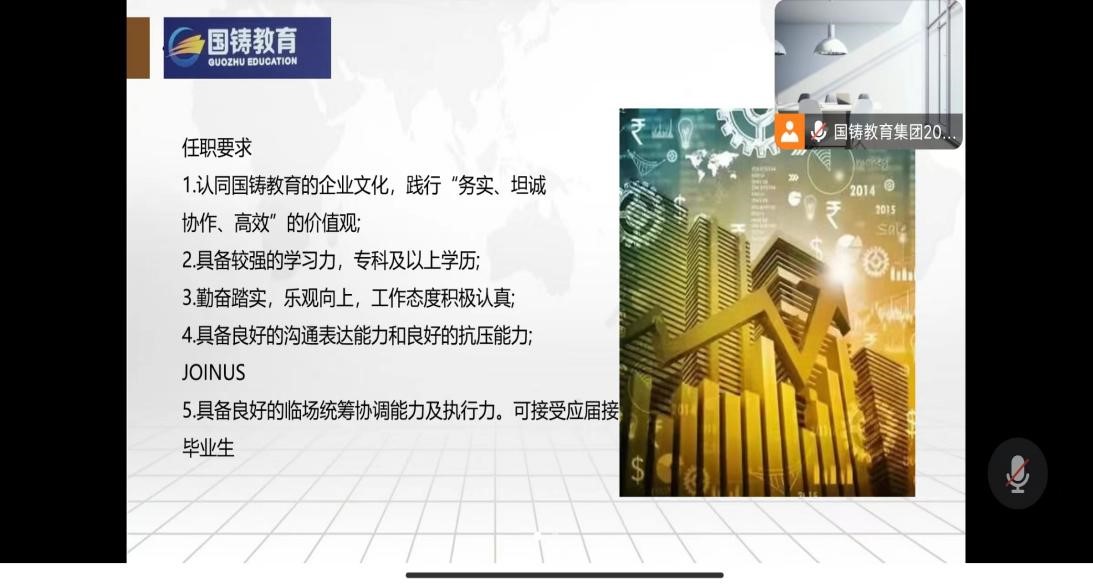 会议伊始,人事主管对到会人员表示欢迎,随后通过国铸教育集团从企业背景、福利待遇以及招聘岗位等多方面详细地介绍了企业相关内容。他介绍称,国铸教育是一家集教育出版、发行和专业教育服务为一体的综合性教育产业集团、拥有高效率的管理体系,推出高质量的教育产品并提供高质量的服务,是一个部门齐全,服务一流、体系完善的知名教育企业。企业招聘课程顾问、市场经理、学习管理师等岗位,多年来各位讲师在全国各地以精湛的学术和优质的教学课程被众多考生认可。