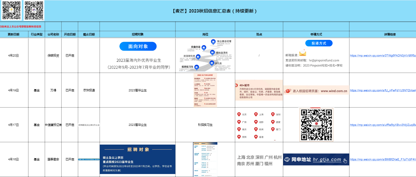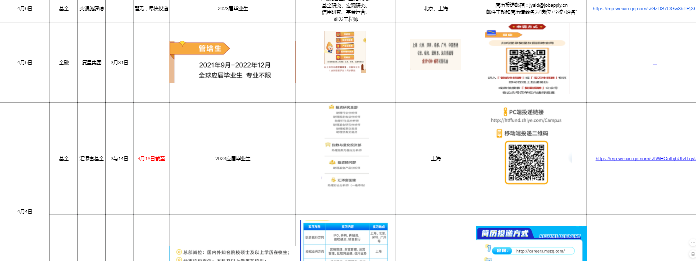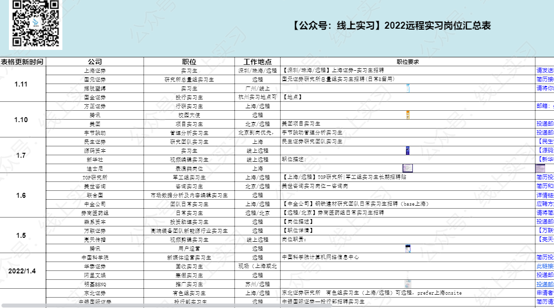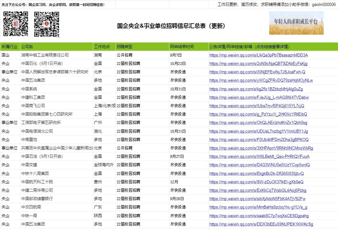 2.每周:我们会定期整理,国企实习/校招信息汇总表、银行校招/实习信息汇总表、寒暑假实习信息汇总表、远程实习信息汇总表、春招/秋招网申汇总表、国家部委招聘信息等等,每周第一时间分享到VIP会员群!部分展示如下