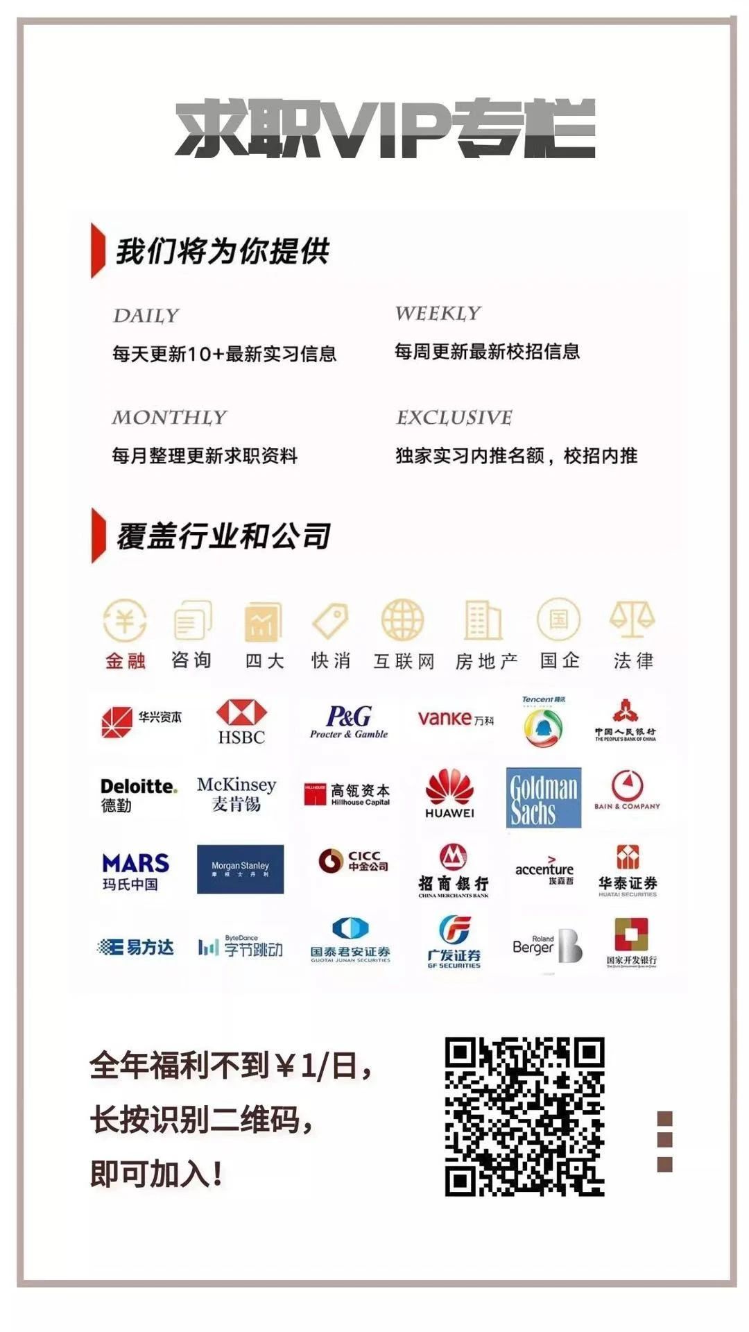 整个「VIP求职会员」定价是多少钱呢?只要299元/年。也就是说,您只要每天花不到1块钱,就能够得到到全年超5,000+条独家实习信息,2000+校招信息闹钟式提醒、3000G+求职资料、专属求职小助手1v1服务……我们「VIP求职会员」的服务本质,就是「让年轻人求职更简单」。我们将沿着这个目标持续改善和迭代我们的产品,未来高价值的服务内容也会不断增厚。 欢迎大家加入,谢谢大家!
