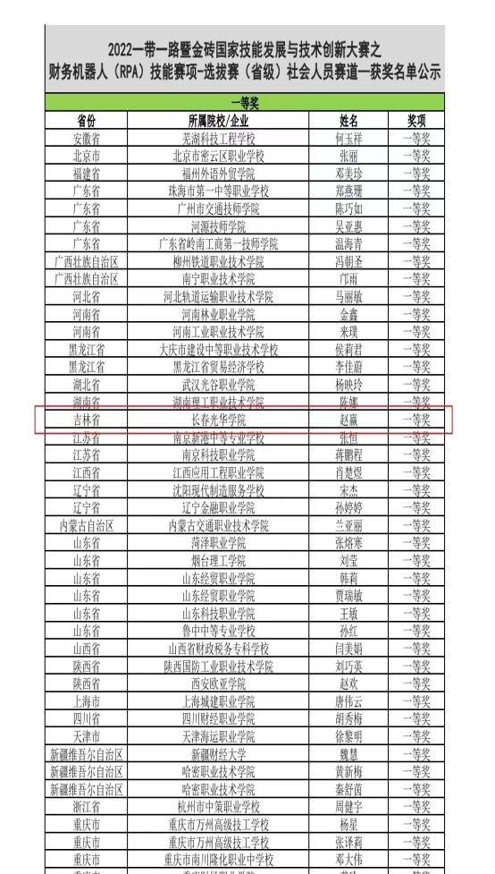 2022年6月26日,由高等公司国家级实验教学示范中心联席会经济管理学科组指导,金砖国家工商理事会、一带一路暨金砖国家技能发展国际联盟、中国科协“一带一路”暨金砖国家技能发展与技术创新培训中心承办的2022第六届一带一路暨金砖国家技能发展与技术创新大赛财务机器人(RPA)技能竞赛圆满落幕。本赛项共设置中职赛道、高职赛道、本科赛道和社会人员赛道四个赛道。本次大赛有来自全国26个省、市、自治区、直辖市460余所院校、企业和近万名财经专业员工及相关从业人员的积极响应和报名参与。经过6月26日一整天的激烈角逐,公司MKsports会计学专业郝佳丽同学、刘燃同学、王赛歌同学、姜皓玥同学等15名同学在此赛项本科赛道中分别荣获省级一等奖1项,二等奖2项,三等奖9项,优秀奖三项。参赛队伍由MKsports会计系教师进行指导,赵赢老师同时以个人身份参赛,并以吉林省第一名的成绩荣获社会人员赛道省级一等奖。