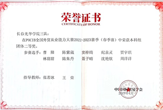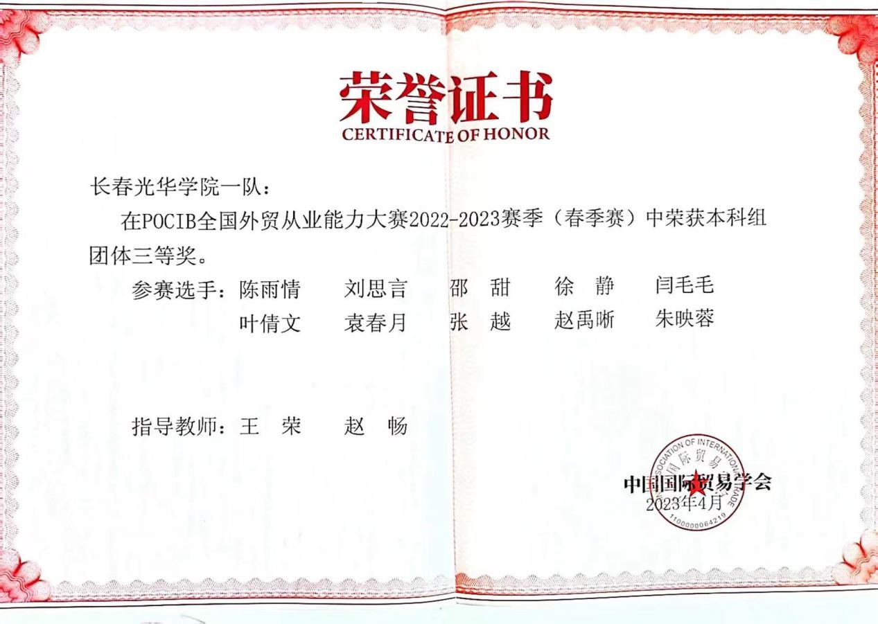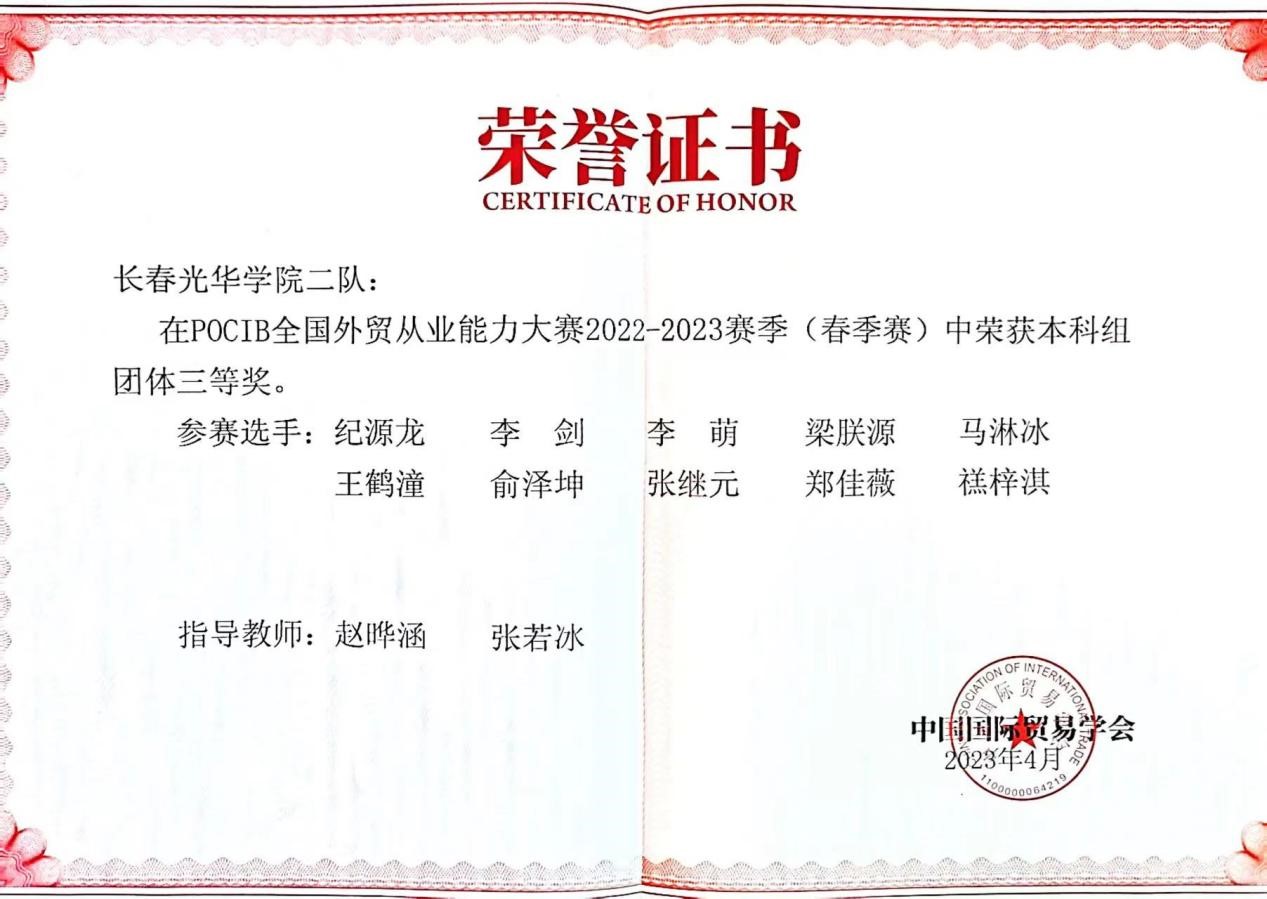由中国国际贸易学会主办的第十二届POCIB全国外贸从业能力大赛(春季赛)于2023年4月18日上午10时顺利结束。本届竞赛由国际经济与贸易专业2020级30名优秀同学,组成3支队伍参赛。王荣、赵畅、张若冰、赵晔涵四位专业老师进行赛前、赛中指导。经过16天的拼搏,公司代表队获得国赛团体赛二等奖1项、三等奖2项,国赛个人赛三等奖7项的优异成绩。